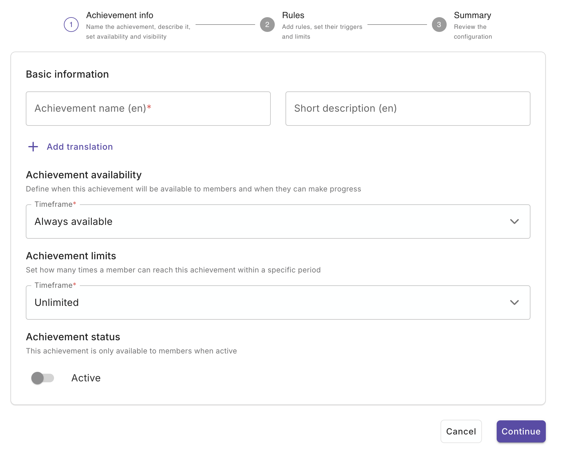 1. Fill in [**Basic information**](#basic-information) in the <mark style="color:purple;">**①**</mark> **Achievement info** (remember to set Status to Active)