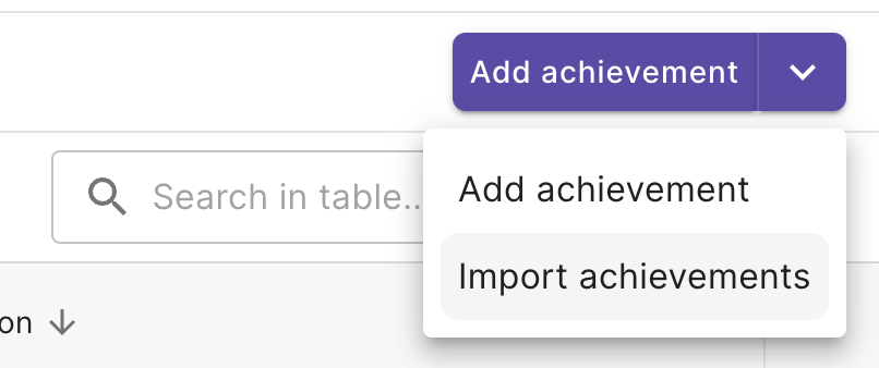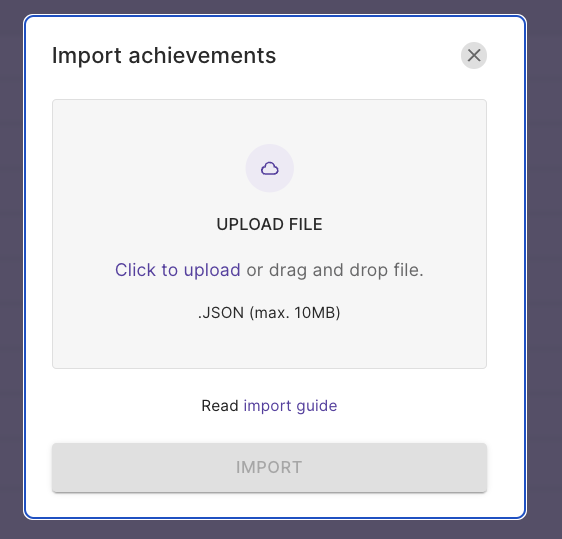 With this option, you can import achievements to Open Loyalty in a JSON file. For more reference, please visit [Achievement export/import.](https://help.openloyalty.io/main-features/managing-achievements#achievement-export-import)