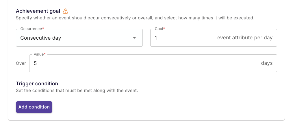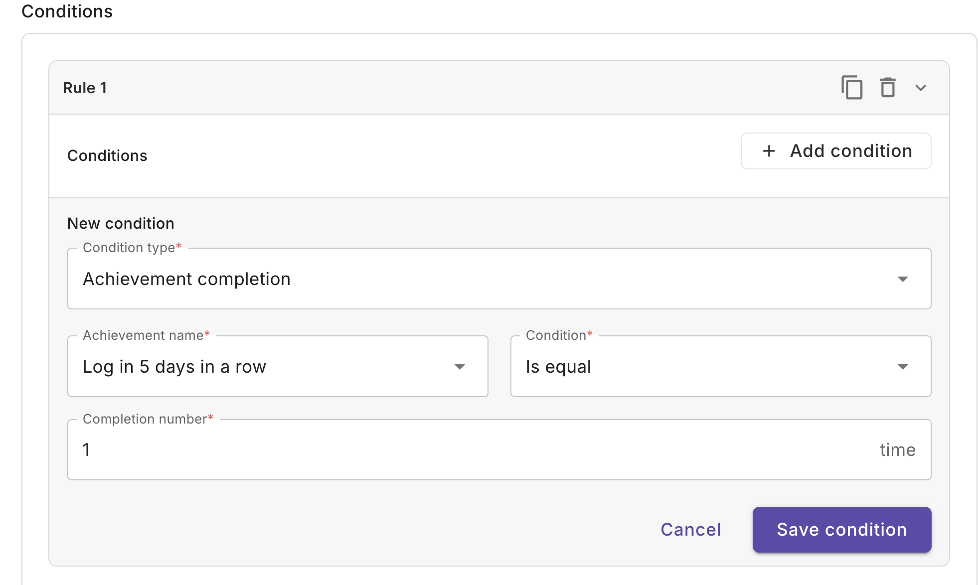 Creating a follow-up achievement enables you to design advanced gamification scenarios that can engage members on multiple levels. The primary goal of this type of achievement is to increase customer retention and sales by providing rewards to members who complete specific conditions. Additionally, it allows you to set achievements as milestones in the loyalty journey.