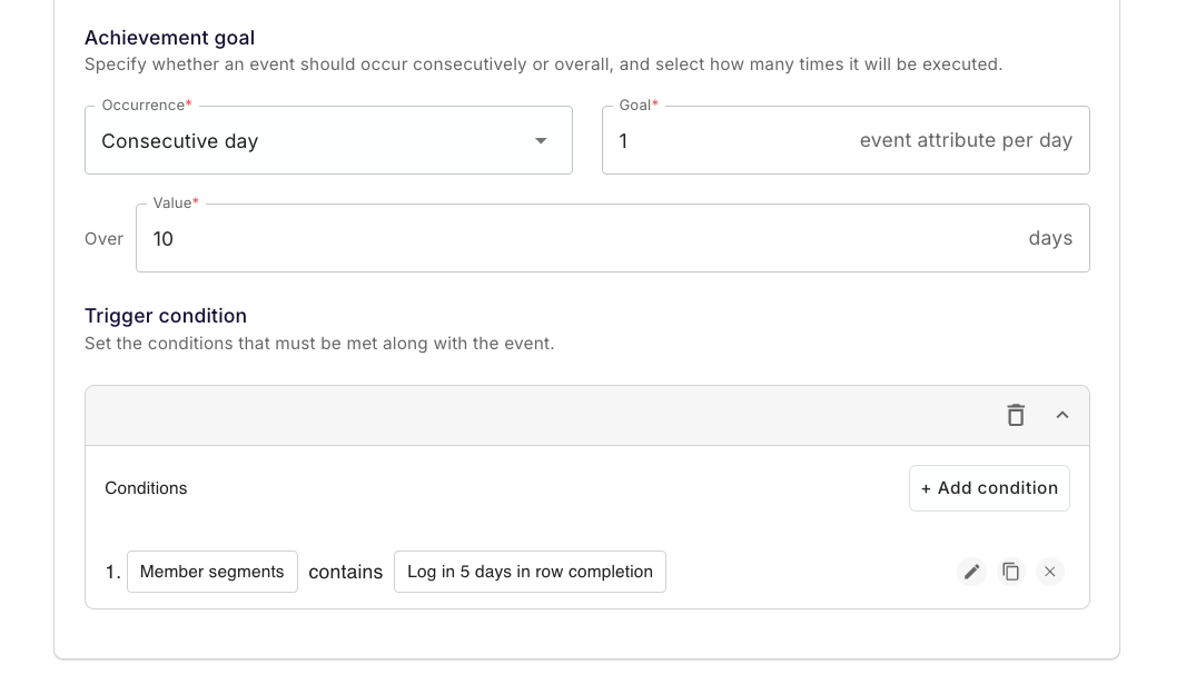 * Use Case: A member has completed the achievement "Login 5 days in a row". When this achievement is fulfilled, the new achievement "Login 10 days in a row" begins. These challenges do not overlap. Therefore, the second login challenge should start with 0 steps and should not have 5 steps already fulfilled because the first one has been completed. The first achievement gives 50 pts and the second 150 pts.&#x20;