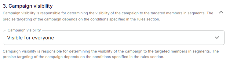 Visibility – Choose who sees the campaign: Everyone, specific Segments/Tiers, or Hidden.