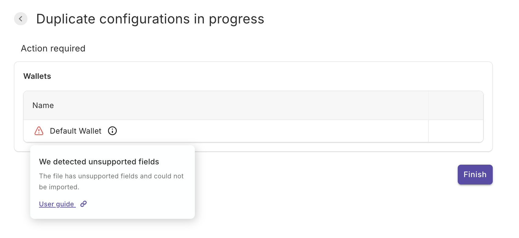 * **Action required - We detected unsupported fields** - The message appears when duplication is not allowed due to unsupported fields. In this case, we tried to duplicate a Wallet that had an existing wallet code in the tenant to which we were attempting to migrate. The error occurred because the wallet code is not editable and must be unique. In summary, the wallet with the existing wallet code cannot be migrated.