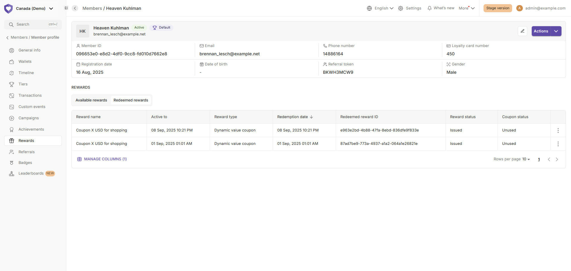 The **Rewards** tab provides a full overview of rewards available to and redeemed by a specific member. This allows administrators to monitor member entitlements, track reward usage, and adjust reward statuses when necessary.