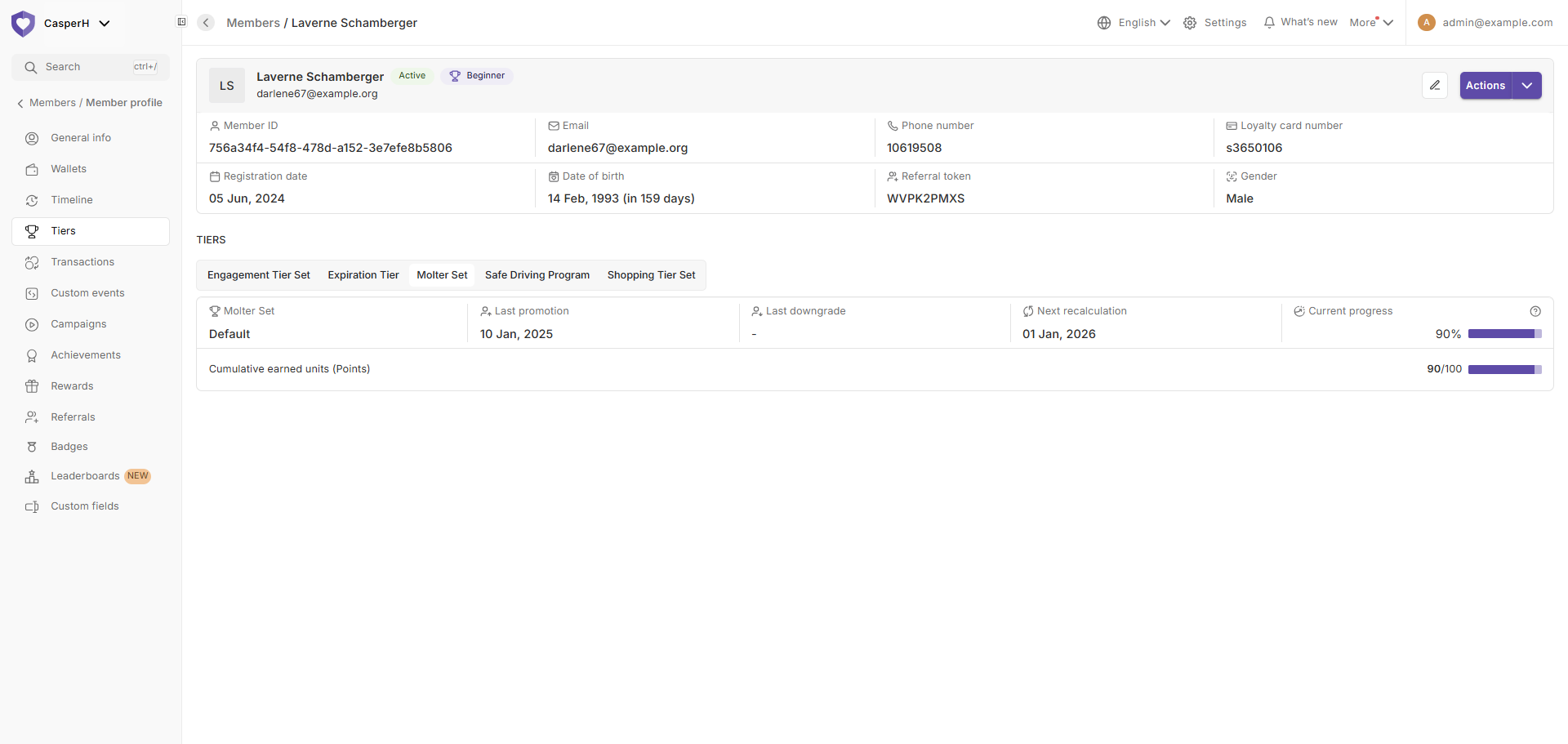 The **Tiers** tab in the single member profile provides detailed insight into a member’s current position in the loyalty program’s tier structure, their historical movements between tiers, and their progress toward the next recalculation.