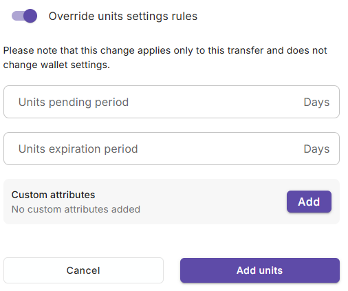 * **Override unit settings rules** — Bypass expiry or locking for this transfer only. This does not change global wallet configuration.