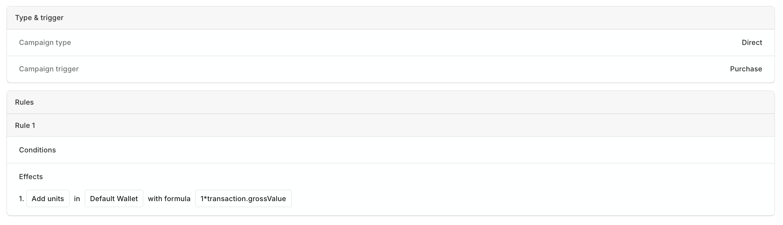 (Add units -> Wallet type: Points wallet -> Calculation formula: 1 * transaction.grossValue)
