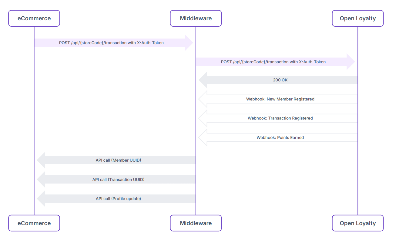 When a customer makes a purchase, the e-commerce platform sends a request to the middleware, which then communicates with Open Loyalty's API to add points based on the transaction value.